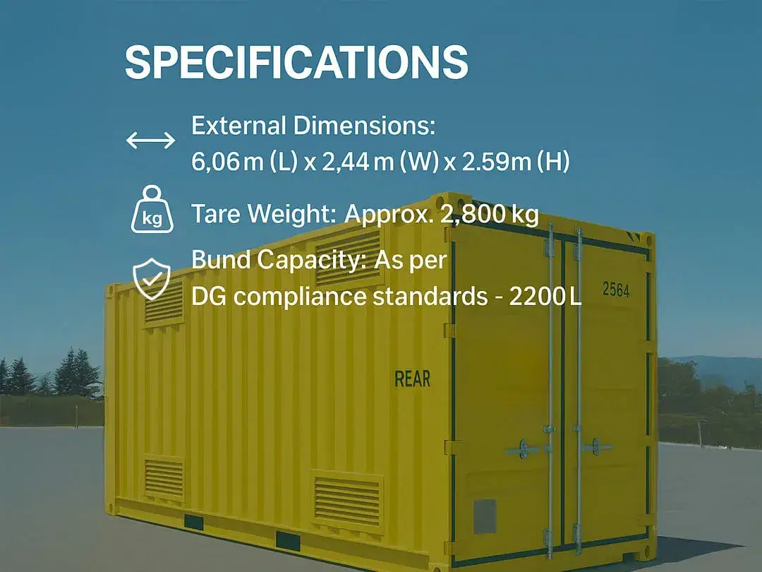 Our 20ft DG Container is purpose-built to store hazardous materials safely and legally. With full AS1940-2017 compliance , this container includes spill bunding, ventilation, and non-spark interiors — making it ideal for fuel, solvents, corrosives, and flammable goods. Perfect for use in mining, civil construction, and industrial applications, this is our most popular chemical storage size. Product Overview? Our 20ft model is the most popular size in the DG container range , providing a large internal volume and all mandatory safety features required for storing Class 3, 6, and 8 substances.